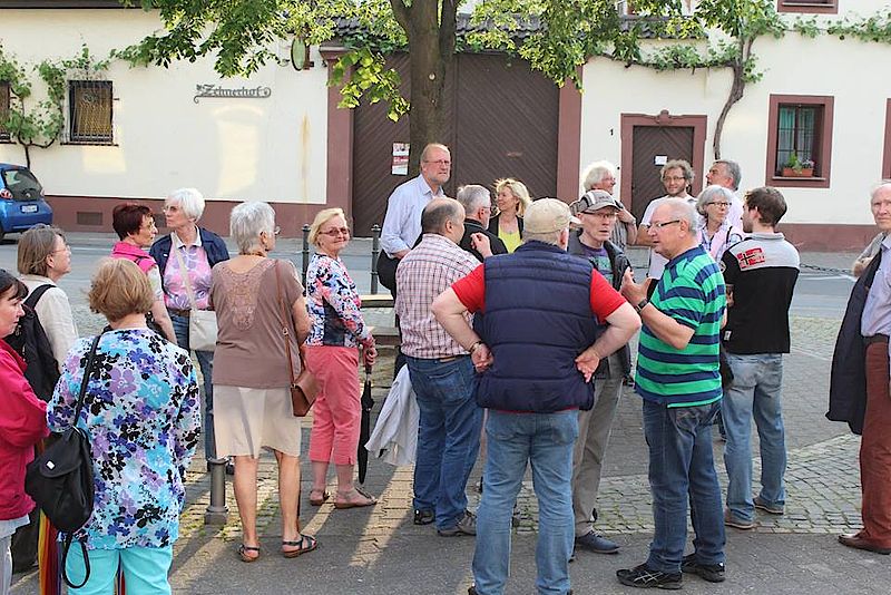 Und so schlängelten sich alteingesessene Hechtsheimerinnen und Hechtsheimer und Bürgerinnen und Bürger, die erst seit einigen Jahren im Stadtteil leben, vom "Dragoner"-Standbild an der Straßenbahn-Endhaltestelle über die Synagogenstraße hinauf zur katholischen Pfarrkirche St.-Pankratius und von dort über das "Eiserne Tor" in der Morschstraße zum Lindenplatz vor der Ortsverwaltung wieder zurück in die Hechtsheimer Ortsmitte. Den gemütlichen Ausklang des Rundgangs bildete der Besuch des Gutsausschanks "Bachhof", in dem bei einem Glas Wein noch ausführlich über das heutige Leben in Hechtsheim gesprochen wurde.