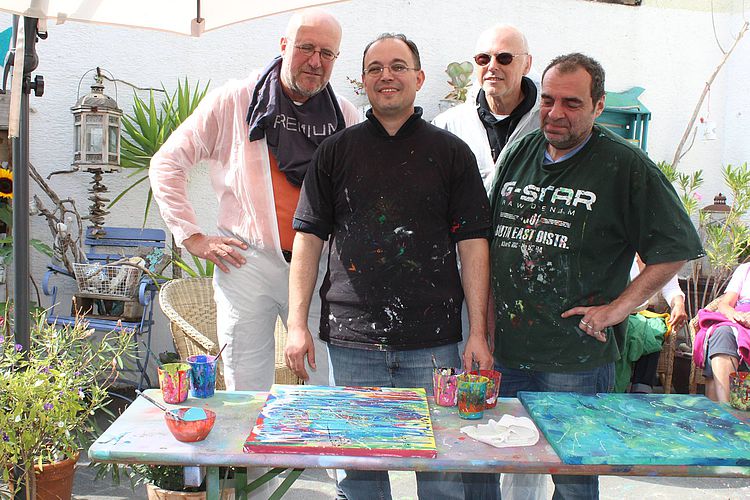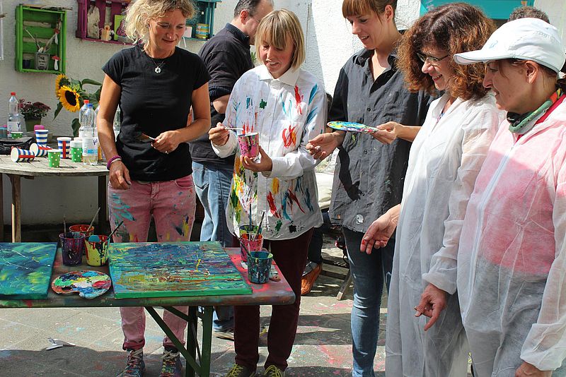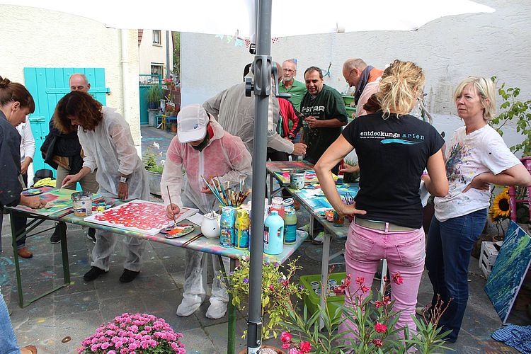In Finthen durften die Radlerinnen und Radler schließlich selbst künstlerisch aktiv werden. Peggy Schumacher betreibt hier mit „Entdeckungsarten“ eine Mal- und Kreativschule für Kinder und Erwachsene. Unter ihrer fachkundigen Anleitung entstanden in Gruppenarbeit mehrere Bilder.