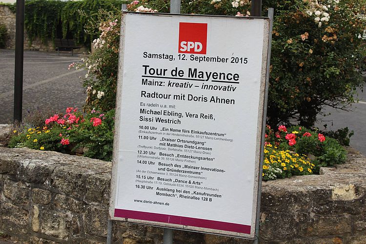 Am 12. September 2015 hat die Mainzer Landtagsabgeordnete Doris Ahnen im zweiten Teil ihrer diesjährigen „Tour de Mayence“, die unter dem Motto „Mainz: kreativ-innovativ“ stand, die Stadtteile Lerchenberg, Drais, Finthen, Gonsenheim und Mombach mit dem Fahrrad bereist. Mit dabei waren neben Bürgerinnen und Bürgern auch der Mainzer SPD-Vorsitzende Michael Ebling, Vera Reiß sowie B-Kandidatin Sissi Westrich. Doris Ahnen: „Wir haben auch dieses Mal wieder nach Orten gesucht, wo man nicht jeden Tag hinkommt. Und vor allem nach Institutionen, die für Kreativität und Innovation in Mainz stehen.“