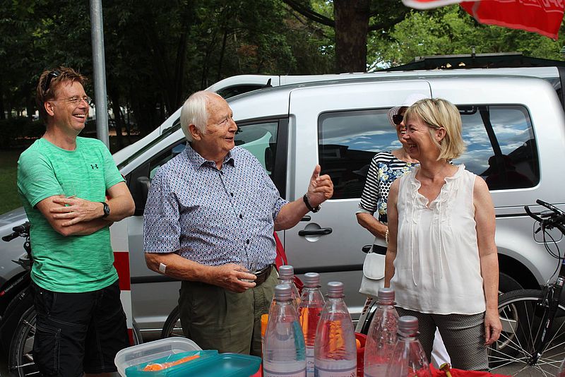 Die erste Geschichte hören die mehr als 30 Mitradlerinnen und Mitradler am Rande des Gonsenheimer Wochenmarkts. Horst Wambach, Ehrenamtler im Stadtteiltreff, liest unter freiem Himmel aus seinem Buch „Herr Patocki geht unter Leute“. Das Buch erzählt in abgeschlossenen Fortsetzungen über das Leben in der „Elsa“, der Hochhaussiedlung am Rande des Gonsenheimer Villengebiets, die für den Autor einen großen Zauber hat.