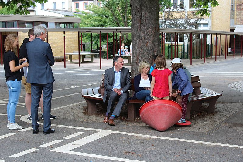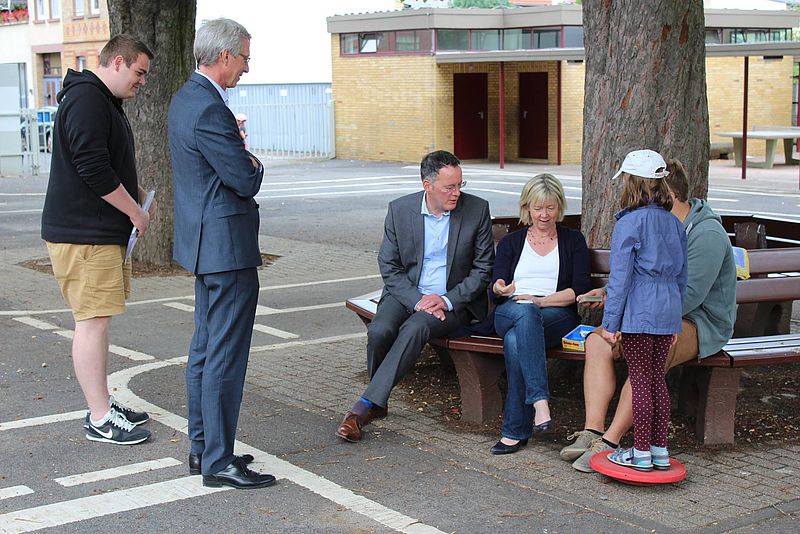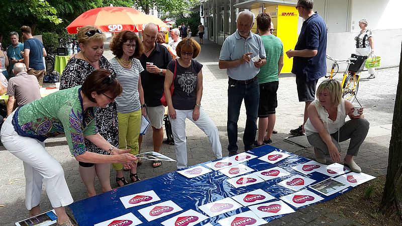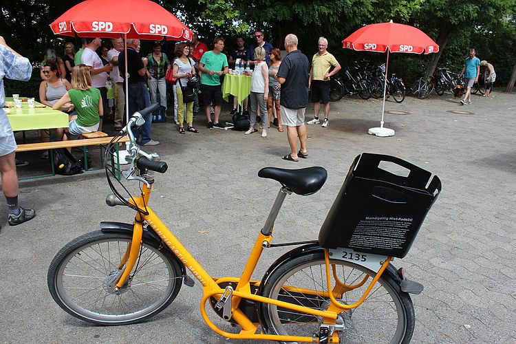 Über die Draiser Senke führt der Weg zum Brunnen am Einkaufszentrum des Stadtteils Lerchenberg, der in diesem Jahr den 50. Jahrestag seiner Gründung feiert. Sissi Westrich und der SPD-Ortsverein haben aus diesem Anlass ein Riesenmemory mit Bildern aus dem Stadtteil gestaltet – ein Riesenspaß für die Radfahrerinnen und Radfahrer sowie den Mainzer Sozialdezernenten Dr. Eckart Lensch, der vor der letzten Etappe zur Gruppe stößt.