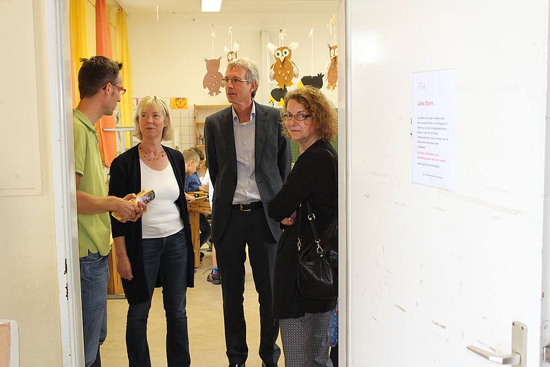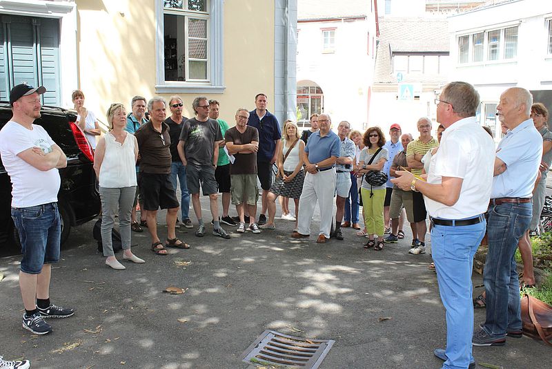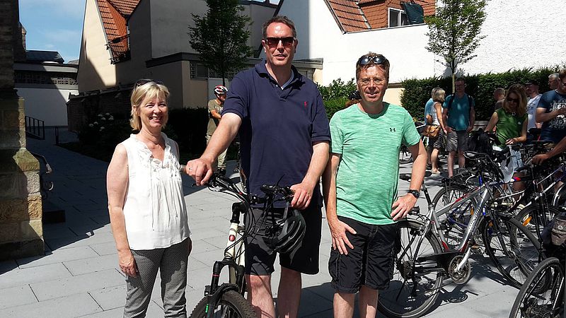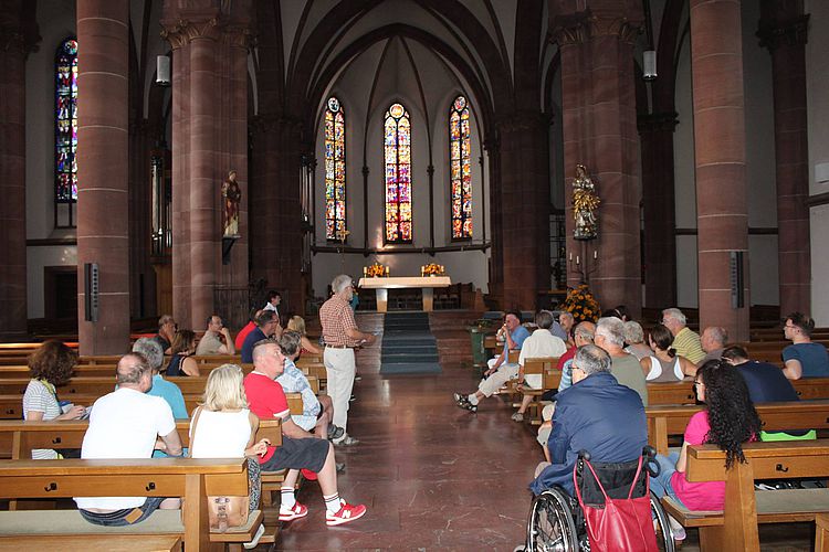 Starck führt die Teilnehmerinnen und Teilnehmer der diesjährigen „Tour de Mayence“ durch die Kirche, die nach einem umfassenden Umbau seit 1906 die größte Landkirche in Rheinhessen ist. Seit mehr als 10 Jahren lädt die SPD-Landtagsabgeordnete Doris Ahnen im Sommer zu einer Wanderfahrt mit dem Fahrrad durch ihren Wahlkreis, der die Außen-Stadtteile von Hechtsheim über Bretzenheim, Marienborn, Drais bis nach Mombach umfasst. Das Motto der diesjährigen Tour, die von Gonsenheim über Finthen und den Lerchenberg nach Hechtsheim führt, ist „Geschichte und Geschichten“ oder wie der Meenzer sagt: „Geschichtcher“.