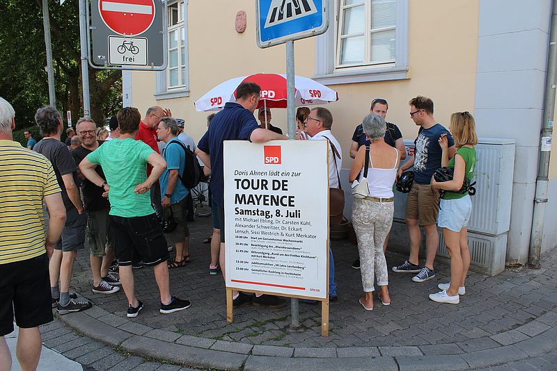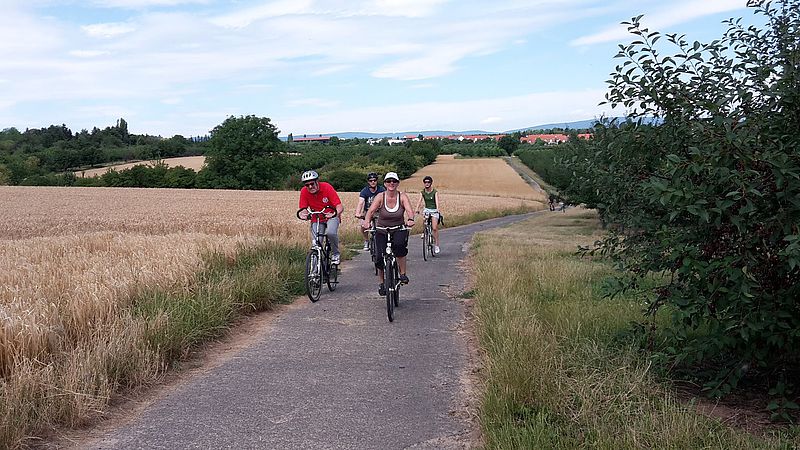 Für die Teilnehmerinnen und Teilnehmer der „Tour de Mayence“, darunter der Vorsitzende der SPD-Landtagsfraktion Alexander Schweitzer und SPD-Bundestagskandidat Dr. Carsten Kühl, beginnt dann am Ortsrand von Finthen der schwierigste Streckenabschnitt. Der Anstieg an der Langen Frechte zwischen den Finther und Draiser Obstfeldern erfordert gute Kondition und eine kleine Übersetzung bei der Kettenschaltung.